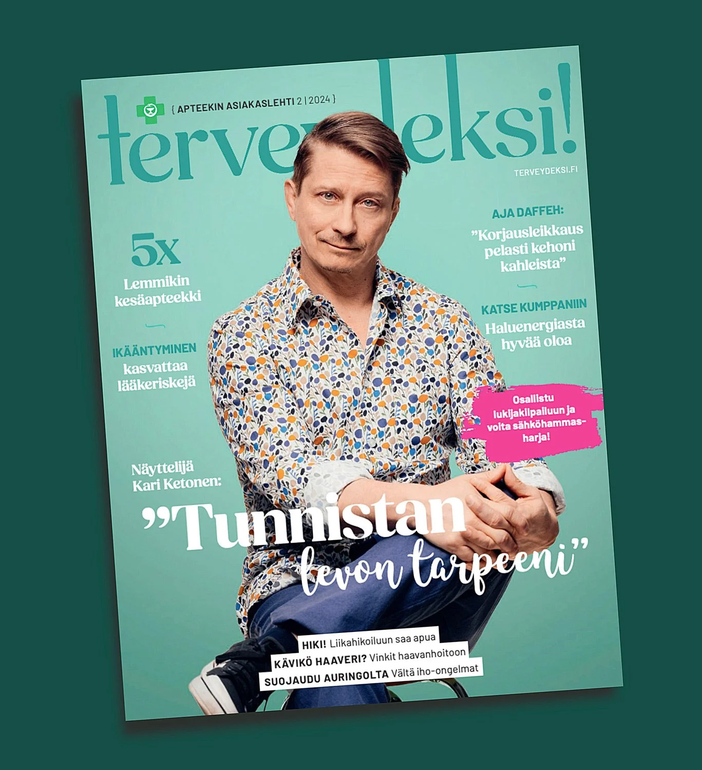 Actor Kari Ketonen is wearing surface design by Iiro A. Ahokas for FRENN on the cover and pages of Terveydeksi 2/2024 magazine published by Suomen Apteekkariliitto / Otavamedia.